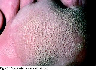 Infektion med Corynebacterium minutissimum ses hyppigt ved ophold under fugtige og varme himmelstrøg, hvor der i hudfolderne udvikler sig det karakteristiske velafgrænsede rødbrunlige udslæt (erythrasma) i inguinalfolderne, specielt hos mænd eller hos personer med hyperhidrose superficiel-infektion i fodsålerne med udstandsede defekter i keratinlaget kaldet keratolysis plantaris sulcatum eller pitted keratolysis (Figur 1 ). Der er ofte tale om tilstande, som kan erkendes på deres karakteristiske klinik. De skal behandles med fusidincreme, og kan delvis forebygges, hvis man anvender løstsiddende beklædning, sover i velventilerede værelser og undgår middagssolen under ferie i troperne.
