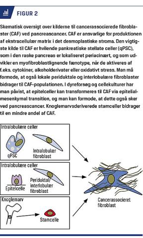 Det desmoplastiske stroma består af ECM (kollagen, fibronektin, laminin, osteonektin og hyaluronan), CAF, makrofager, små blodkar og betændelsesceller [2]. aPSC anses for at være den vigtigste kilde til CAF og dermed den desmoplastiske stromale reaktion ved pancreascancer, men lokale fibroblaster og knoglemarvsderiverede stamceller bidrager formentlig også til CAF-populationen (Figur 2) [10, 11]. Man må desuden formode, at også epitelial-mesenkymal transition (EMT) og periduktale fibroblaster bidrager til CAF, men dette er ikke tilstrækkeligt undersøgt ved pancreascancer [11]. Resultaterne af cellekulturstudier og dyreforsøg indikerer et nært samspil mellem karcinomcellerne og aPSC, der gensidigt fremmer hinandens vækst og differentiering, først og fremmest via produktion af vækstfaktorer, en proces, der betegnes som heterotyp signalering [12]. Tumorassocierede makrofager indgår også i disse cellulære interaktioner [13]. I cellekulturstudier har man påvist, at karcinomcellerne kan stimulere