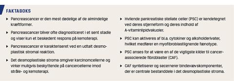 I Danmark diagnosticeres der hvert år næsten 1.000 patienter med pancreascancer, og femårsoverlevelsen er på kun 5% [1]. Pancreascancer er histologisk kendetegnet ved en voldsom bindevævsreaktion, det såkaldte desmoplastiske stroma, som ledsager og omgiver de invasive karcinomceller (Figur 1). Desmoplasien kan udgøre op mod 70-80% af det samlede tumorvolumen, og cellekulturstudier og dyreforsøg tyder på, at desmoplasien reducerer kemoterapeutiske stoffers effekt på cancercellerne [2]. Det desmoplastiske stroma syntetiseres af cancerassocierede fibroblaster (CAF), og en af de vigtigste kilder til CAF er de pankreatiske stellate celler (PSC) [3]. PSC differentierer til en myofibroblastlignende fænotype, når de aktiveres af cytokiner, alkoholderivater eller oxidativt stress [4, 5]. Myofibroblaster har en fænotype mellem glatmuskelceller og fibroblaster. Ved vævsskade producerer de ekstracellulær matrix (ECM). Formålet med denne artikel er at beskrive PSC’s og desmoplasiens rolle i udviklingen og behandlingen af pancreascancer.