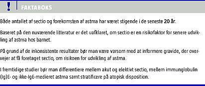 I to tidligere review har man konkluderet, at der var en samlet øget risiko på 20% [7, 8]. Denne konklusion kan vi ud fra vores litteraturgennemgang ikke bekræfte. Diskrepansen skyldes overvejende, at vores fokus har været på astma, og vi har derfor ikke inddraget børn under tre år, hos hvem astmadiagnosen er usikker. Vi konkluderer således, at det i øjeblikket er uafklaret, om sectio er en risikofaktor for udvikling af astma.