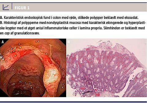 Ved en histologisk undersøgelse fandt man hyperplastiske polypper beklædt med en cap af inflammatorisk ekssudat, hvilket er karakteristisk for diagnosen CP (Figur 1B).