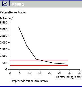 Mellem kl. 10.00 og 12.00 om formiddagen indtog pigen ca. 30 ml valproat orale dråber 200 mg/ml. Pigens vægt var 15 kg, så indtaget svarede til 400 mg/kg). Efter indtagelsen sov pigen tungt, men var helt vågen ved Falcks ankomst 3-4 timer senere. Hun modsatte sig kraftigt undersøgelse og behandling ved indlæggelsen. Der var normal øjenkontakt, normale farver og intet unormalt ved den objektive undersøgelse. Blodtrykket var 101/63 mmHg, pulsen 120 og O2-saturationen 100%. Ved indlæggelsen kl. 15.45 blev der umiddelbart indgivet 10-12 g aktivt kul opslemmet i vand på sonde. Der var ingen opkastning. Der blev udtaget blod til bestemmelse af serumvalproatkoncentration straks, dvs. ca. 4-6 timer efter formodet indtagelse og igen kl. 20.00, 00.15, 08.40 og 16.00 (Figur 1 ). Laktatkoncentrationen var forhøjet til 3,5 og 3,8 mmol/l og ammoniumkoncentrationen forhøjet til 70 mikromol/l. Disse blev normaliseret 12 timer efter formodet indtagelse. Øvrige blodprøver og syre-base-status var normale. Pigen blev observeret tæt med telemetri og forblev klinisk upåvirket. Hun blev udskrevet i velbefindende efter knap to døgns indlæggelse og genoptog herefter behandlingen med valproat.