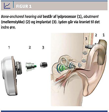 Et knogleforankret høreapparat består af tre dele: 1) lydprocessoren 2) abutment (mellemstykket) og 3) implantatet (Figur 1). Implantatet isættes i temporalbenet 5-6 cm bag øregangen (Figur 2). Implantatet er en selvskærende titaniumskrue, og nogle implantater har en ru overflade på den intraossøse del for at forbedre osseointegrationen. Længden af abutment kan varieres ud fra tykkelsen af det subkutane væv. Lydprocessorerne er specialfremstillede høreapparater, som omsætter den indkomne lyd til vibrationer. Lydprocessorerne kan knappes på implantatet bag øret og findes i forskellige styrker. Ønskes der maksimal lydforstærkning, kan en kropsbåren lydprocessor tilkobles.