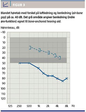Den hyppigste indikation for Baha er konduktive høretab, dvs. høretab, som skyldes en defekt i lydledningsapparatet, samt blandede høretab. Det kan dreje sig om patienter, som har gennemgået talrige mellemøreoperationer, men uden at opnå tilfredsstillende hørelse. Også patienter med konduktivt høretab pga. otosklerose eller øregangsatresi kan have gavn af Baha. Disse patientgrupper har et air-bone gap på audiogrammet (Figur 3). Benledningen (funktionen af det indre øre) skal være bedre end 55 dB, for at det knogleforankrede høreapparat kan løse