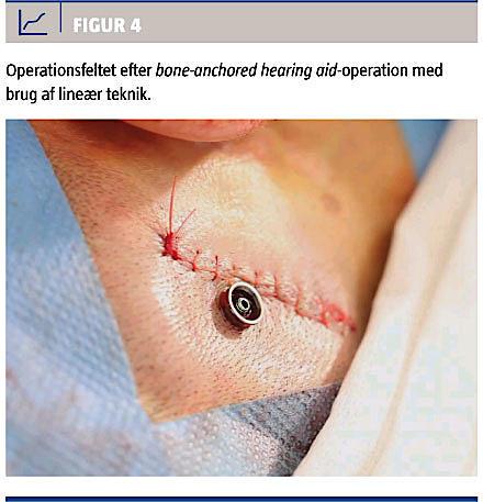 ling af boret af hensyn til osteocytter og knoglenydannelse. Der kan benyttes kirurgisk teknik med en hængslet hudlap eller teknik med lineær incision (Figur 4) alt efter kirurgens præference. Implantatets længde er 3 eller 4 mm; der vælges et kort implantat hos patienter med tynd knogle (børn). Der vælges en passende længde mellemstykke (6-12 mm) afhængig af tykkelsen af det subkutane væv. Efter seks uger kan processoren monteres på implantatet. På nogle centre vælger man at montere processoren allerede fire uger efter operationen. Ved dårlig knoglekvalitet (strålebehandlet knoglevæv) bør høreapparat monteres efter tre måneder.