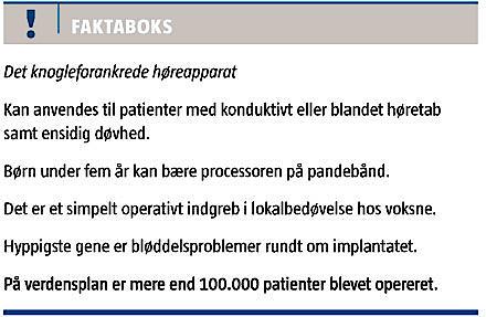 lation af hårcellerne i det indre øre [1]. På denne måde bypasses hørenedsættelser, som skyldes lidelser i det ydre øre, øregangen og mellemøret. Lyden fra det knogleforankrede høreapparat går via kraniet til begge cochleae, således at patienter med ensidig døvhed også har gavn af apparatet.