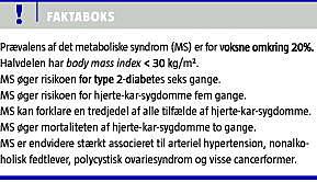 Metabolisk syndrom (MS) har været gjort til genstand for megen debat igennem de senere år, men samtidig har vi erhvervet ny viden om, hvordan syndromet opstår samt vished for dets store udbredelse og stigende prævalens (omkring 20%) [1].