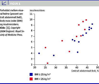 Figur 1 viser sammenhængen mellem graden af insulinresistens og procent intraabdominalt fedt, som her er målt med en dual energy X-ray absorptiometry (DEXA)-skanning i to grupper af personer med forskelligt BMI, nemlig normalvægtige med BMI ≤ 25 kg/m2 og overvægtige med BMI ≥ 25 kg/m2 [7]. Som det fremgår af figuren, afhænger graden af insulinresistens af graden af visceralt fedt og ikke af den totale vægt. Dette er nu fundet i mange undersøgelser, ligesom det er vist, at fedt på bagdelen, lårene og overarmene ser ud til at have en beskyttende effekt mod MS, idet disse personer ikke er insulinresistente, men snarere har normal eller øget insulinfølsomhed og endvidere har en nedsat risiko for kardiovaskulær sygdom (KVS) [8].