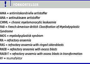 Resultater: Der var en signifikant øget incidens af autoimmun sygdom blandt patienterne. Der fandtes ingen sammenhæng mellem tilstedeværelse af autoimmun sygdom og alder, køn, FAB- eller karyotype.