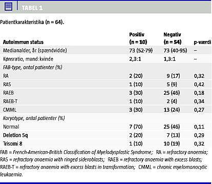 Karakteristika for de 64 patienter, der indgik i undersøgelsen, fremgår af Tabel 1 . Ved hjælp af Fishers eksakte test sammenlignedes de to patientgrupper med hensyn til fordelingen af patienterne i henhold til FAB-klassifikationen [11] og karyotype. Alle de fundne p-værdier var større end 5%. De autoimmunt syge MDS-patienter har således ikke en signifikant forskellig fordeling i henhold til FAB-klassifikationen og karyotype end de autoimmunt raske.