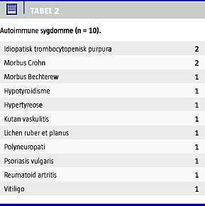 I materialet fandt vi elleve forskellige autoimmune sygdomme hos de ti patienter med autoimmun sygdom. Dette svarer til en frekvens på 16%. De autoimmune sygdomme, der blev identificeret, er vist i Tabel 2 . Den beregnede frekvens af autoimmun sygdom bygger på FAB-klassifikationen af MDS. Anvendes i stedet World Health Organization Classification and Criteria for Myelodysplastic Syndromes (WHO's klassifikation) af MDS, udgår patienterne med chronic myelomonocytic leukaemia (CMML) og refractory anemia with excess blasts in transformation (RAEB-T), idet de i stedet henregnes til de myelodysplastiske/myeloproliferative sygdomme [12]. Ved anvendelse af WHO-klassifikationen resterer der således kun 45 patienter, der opfylder de diagnostiske kriterier for MDS, hvoraf de seks har samtidig forekommende autoimmun sygdom. Dette svarer til en frekvens på 13%.