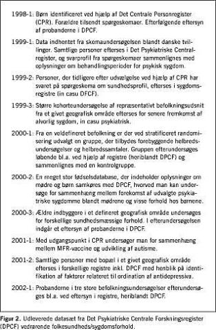 Otte tager udgangspunkt i populationsbaserede kohorter, der prospektivt/retrospektivt efterses i DPCF for behandlingsperioder i det psykiatriske sygehusvæsen. Et (2000-2) tager udgangspunkt i en fødselskohorte; hvorefter børnenes mødre efterses retrospektivt for behandlingsperioder i det psykiatriske sygehusvæsen. I et andet (2001-1) samkører man to registre, hvoraf indeksregisteret indeholder alle, der i Danmark i en periode er blevet MFR-vaccinerede. Dette register kan karakteriseres som et populationsregister. Probanderne efterses i DPCF for efterfølgende behandlingsperioder i det psykiatriske sygehusvæsen.