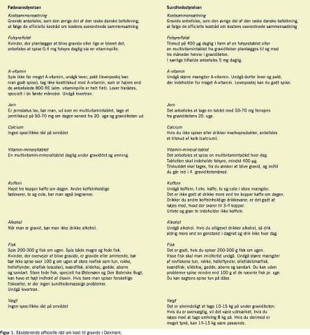 Øvrige anbefalinger (Figur 1) om at undgå for meget A-vitamin, koffein og visse fisk, der ligger højt i fødekæden (maks. 100 g om ugen af disse), følge de kostråd, som gives til den øvrige befolkning, og tage en multivitamin-mineraltablet dagligt i hele graviditeten fandtes alle at være afbalancerede og velbegrundede [1].