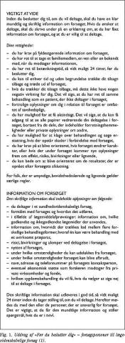 Der er i 1999 udgivet en særlig bekendtgørelse om information og samtykke ved inddragelse af forsøgspersoner i biomedicinske forskningsprojekter - og denne er i 2000 fulgt op med en detaljeret vejledning til forskerne om biomedicinske forsøg (2, 3). I vejledningen uddybes bl.a., hvilke krav der stilles til forskerne om de punkter, som fremgår af Fig. 1.