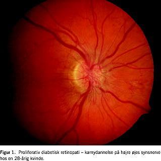 Proliferativ diabetisk retinopati er karakteriseret ved kar-nydannelse, som opstår pga. iltmangel i nethinden (Figur 1). De skrøbelige nydannede kar kan give anledning til blødninger i glaslegemet og heraf følgende synstab, dels pga. selve blødningen, dels pga. følgetilstande med bindevævsdannelse og nethindeløsning.