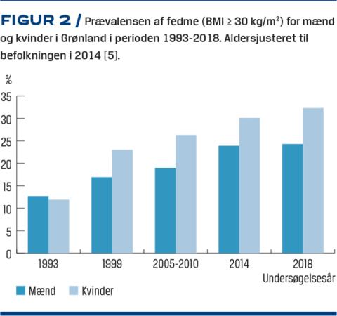 Den ekstreme stigning i diabetesprævalensen tyder på en betydelig komponent, som er relateret til ændrede levekår, primært forbedret overlevelse. Fedme og faldende mængde fysisk aktivitet er også i Grønland identificeret som vigtige årsager til diabetes. I befolkningsundersøgelsen i 2017-2018 var så stor en andel som 26% af befolkningen svært overvægtig med et BMI > 30 kg/m2, til sammenligning var dette tilfældet for ca. 12% i 1993 (Figur 2) [5].