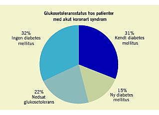 Samtidig har det vist sig, at diabetes er langt hyppigere end antaget hos patienter med koronar sygdom. I ovennævnte undersøgelse havde 11% kendt diabetes. Denne prævalens er i nyere studier fundet at være betydelig højere: op til 30%. I ældre undersøgelser blev det påvist ved anvendelse af oral glukosetoleranstest hos patienter med grænseforhøjede værdier for plasmaglukose eller HbA1c, at ca. 5% havde uerkendt diabetes. Ved anvendelse af oral glukosetoleranstest hos alle patienter med et nyligt akut myokardieinfarkt er det i to nye undersøgelser vist, at prævalensen af diabetes og nedsat glukosetolerans er langt højere. Således har blot 32% af patienterne med akut myokardieinfarkt normal glukosetolerans (Figur 1).