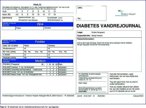 Kvaliteten af diabetesbehandlingen har i de fleste studier vist sig kun at være moderat god, specielt hvad angår komplikationsscreening, men også med hensyn til, om patienterne opnår de rekommanderede mål for blodtryk, kolesterol og glykeret hæmoglobin (HbA1c ) [1, 2]. Der er stigende evidens for, at patientinvolvering spiller en central rolle i forbedring af behandlingskvaliteten [3, 4]. Det at give patienterne personlige feedbackdata synes at bedre behandlingen [5, 6]. På den baggrund er der udviklet og introduceret patientvandrejournaler i flere lande, dog med varierende succes [7, 8]. H:S's sundhedsfaglige råd for diabetes udviklede sidst i 1990'erne en diabetesvandrejournal med patienternes anamnese, seneste undersøgelsesresultater, medicin etc. Vandrejournalen indeholder således en omfattende mængde diabetesrelateret information.