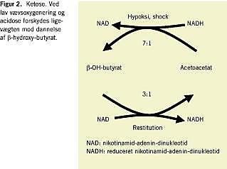 Insulinmangel og overskud af modregulatoriske hormoner (bl.a. cortisol, glukagon og katekolaminer) medfører uhæmmet lipolyse med øget frisætning af frie fedtsyrer. Forbrænding af acetyl-CoA via citratcyklus hæmmes på grund af forbrug af oxaloacetat til den uhæmmede glukoneogenese. Utilstrækkelig omsætning af acetyl CoA resulterer i øget dannelse af ketonstofferne acetoacetat og β -hydroxy-butyrat, som udgør et redoxpar. Ved tilstande med lav vævsoxygenering og acidose forskydes ligevægten over mod dannelse af β -hydroxy-butyrat (Figur 2 ). Under behandlingen normaliseres forholdet β -hydroxy-butyrat/acetoacetat, hvorfor der nogle gange kan iagttages en forbigående stigning i urinacetoacetat i takt med den almene bedring. Ketose kan diagnosticeres semikvantitativt ved påvisning af ketonuri (acetoacetat i urinen), bestemt ved nitroprussidreaktionen. Måling af β -hydroxy-butyrat i blodet ved hjælp af en nylig udviklet stiksmetode og håndholdt analyseapparatur (Medisense, Precision) kan gennemføres på 30 sekunder. Metoden er vurderet og fundet pålidelig [3]. Normalområdet for β -hydroxy-butyrat i blod er < 0,5 mmol/l. Ved DKA ses der typisk værdier over 3,0 mmol/l. En blod-keton-stiks koster ca. 25 kr., mens en urin-keton-stiks koster ca. 2 kr. Fordelene ved måling af β -hydroxy-butyrat i blodet er: 1) at den i højere grad end urinacetoacetat afspejler ketosen, 2) at målinger i blodet giver et øjebliksbillede, hvor urinmålinger afspejler et gennemsnit af ketosen i den producerede urin, og 3) at måling af β -hydroxy-butyrat er kvantitativ, mens måling af urinacetoacetat er semikvantitativ: hos diabetespatienter med uræmi og acidose kan dette have betydning for diagnosticering af DKA.