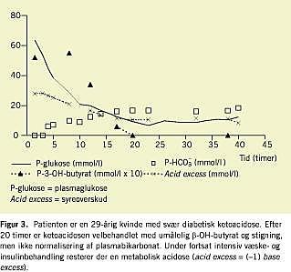 Bikarbonatinfusion blev tidligere givet med normalisering af syre-base-status for øje. Morris et al [7] påviste i en prospektiv randomiseret undersøgelse, at bikarbonat-infusion generelt ikke har fordele hos patienter med svær DKA (pH 6,9-7,1). Langsom infusion af f.eks. 500 ml isotonisk natriumbikarbonat bør dog overvejes hos svært acidotiske patienter (pH < 6,9). Normalisering af syre-base-status skal ikke tilstræbes ved bikarbonatinfusion, idet denne behandling rummer en teoretisk risiko for forværret acidose i centralnervesystemet. Intensiv insulinbehandling bør fortsætte uafbrudt, indtil almentilstanden er bedret, og acidosen er aftaget. En målsætning om normalisering af indikatorer for metabolisk acidose kan være for ambitiøs, idet der kan restere en behandlingsinduceret metabolisk acidose efter eliminering af ketosen (Figur 3 ). Scheingraber et al [8] har påvist, at infusion af flere liter NaCl under operation medfører pH-fald og negativ base-excess . Dette fænomen kan ikke forklares ud fra den klassiske Henderson-Hasselbalch -ligning, som beskriver samspillet mellem syrekonstanten, syre-base-ligevægten og pH i simple syre-base-systemer. I plasma påvirkes pH-værdien af et mere komplekst samspil mellem ladede partikler [9]. I al korthed findes pH positivt korreleret til stærk-ion-differencen (SID), som for praktiske formål kan sidestilles med [Na+ ] + [K+ ] - ([Cl- ] + [laktat- ]). SID i plasma er normalt ca. 40 mmol/l. Infusion af isotonisk NaCl, som har SID-værdien 0, medfører et fald i plasma-SID og dermed i pH. Hyperkloræmisk acidose er et eksempel på stærk-ion-acidose. Den kliniske betydning heraf er, at den intensive insulin- og væskebehandling kan afsluttes, såfremt: 1) der er opnået klinisk restitution, 2) plasmastandardbikarbonat eller venøs plasmatotal CO2> 15 mmol/l og 3) ketosen er elimineret dvs. β -hydroxy-butyrat er normaliseret. Den acidotiske tilstand vil sædvanligvis herefter normaliseres under fortsat behandling med subkutan insulin.