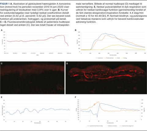 Diagnostisk var kriterierne for småfiberpolyneuropati opfyldt med nedsat sensibilitet for stik og kulde distalt fra håndled og knæ, signifikant nedsat svedsekretion på det distale ben målt ved kvantitativ sudomotorisk aksonreflekstest (Figur 1B) og nedsat intraepidermal nervefiberdensitet ved hudbiopsi med komplet denervering (Figur 1C + D).