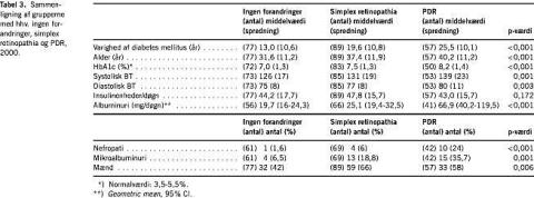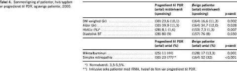 I Tabel 3 sammenlignes mulige risikofaktorer ved undersøgelsens start hos patienter uden øjenbaggrundsforandringer med simplex retinopathia eller med proliferativ retinopati. Langvarig diabetes, høj alder, høj HbA1c, højt blodtryk, mikroalbuminuri, nefropati og mandligt køn var alle risikofaktorer for udvikling og progression af øjenbaggrundsforandringerne. Tabel 4 viser univariate sammenligninger af patienter, der er progredieret til proliferativ retinopati ved undersøgelsens afslutning, med øvrige patienter, der indgik i studiet (bortset fra patienter med proliferativ retinopati ved start). Multivariat logistisk regressionsanalyse viste, at de uafhængige risikofaktorer for progression til proliferativ retinopati var høj HbA1c (p < 0,01), mikroalbuminuri (p < 0,05) og simplex retinopathia ved studiets start (p < 0,01).