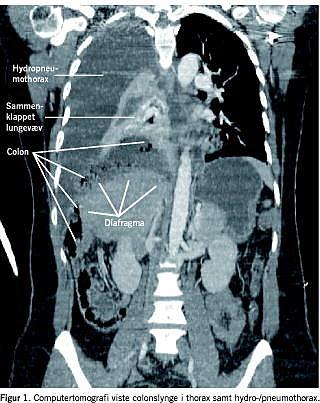 viste en helt hvid højre lunge. En senere computertomografi afslø-rede en colonslynge i thorax og hæmo-/pneumothorax. Almentil-standen blev akut forværret, og hun blev - i et billede af livtruende sepsis - flyttet til en operationsfacilitet, hvor man ved åben torakotomi fandt et inkarcereret kongenit diafragmahernie. Efter operationen blev patienten udskrevet i velbefindende med midler-tidig stomi.