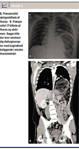 En 17-årig tidligere sund og rask mand henvendte sig på skadestuen med voldsomme diffuse torakoabdominalsmerter (visuel analog skala = 9), takykardi (hjertefrekvens =115 slag/min), takypnø (respirationsfrekvens = 32 åndedrag/min) og akut påvirket almentilstand. Der var intet luftskifte i hele venstre side af thorax. Resultaterne af venøse og arterielle blodprøver lå inden for normalområdet. En røntgenoptagelse af thorax (Figur 1A) og efterfølgende traume-CT (Figur 1B) viste en venstresidig diafragmaruptur med milten, ventriklen, en colonslynge og et lille tyndtarmsegment beliggende i venstre thoraxhalvdel. Ved akut laparotomi blev organerne mobiliseret tilbage i abdomen, og diafragmadefekten blev lukket med enkeltknuder, nonresorberbar sutur (prolene 2-0).