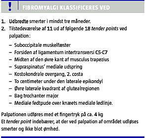 Summary Fibromyalgia diagnosis, treatment and prognosis Ugeskr Læger 2010;172(24):1827-1830 It is important to recognize the diagnosis of fibromyalgia (FM) to adequately advise patients with this chronic pain disease. FM coexists with other rheumatic diseases and may therefore serve as a confounder in connection with estimation of disease activity. The aetiology and pathogenesis of FM remain unknown, although central sensitisation seems to play a major role. Following exclusion of a number of differential diagnoses, the remaining patients have several treatment options including centrally-acting medication.