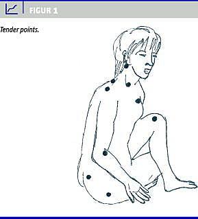 Kriterierne for fibromyalgi omfatter ifølge American College of Rheumatology (ACR) primært udbredte smerter i mindst tre måneder [6]. Man taler om udbredte smerter, når der er smerter i begge sider af kroppen, smerter både under og over livet samt i det aksiale skelet. Dertil føjes tilstedeværelse af smertereaktion ved palpation i 11 ud af 18 foruddefinerede tenderpoints (Figur 1 ). De enkelte tenderpoint og tallet 11 er valgt ud fra en beregning af sensitivitet og specificitet [8]. Palpationen udføres med et fingertryk på ca. 4 kg, og et tenderpoint indebærer, at der ved fingertrykket udløses smertereaktion i form af enten lokal muskelsammentrækning, afværgemanøvre eller verbal reaktion.