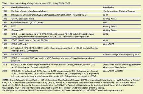 Den historiske udvikling set internationalt er beskrevet iTabel 1. ICD-systemet har ændret sig fra oprindelig at beskrive mortalitet til nu at beskrive morbiditet. Den nyeste version er ICD-10, som blev taget i anvendelse i Danmark i 1994. Den er udbygget med ca. 10.500 danske diagnoser (der er angivet med et bogstav efter ICD-10-koden). Denne danske modifikation af ICD-10 kaldes »Klassifikation af sygdomme«. Den er uhyre detaljeret (ca. 20.500 diagnoser) og fungerer som en »slutpunktsklassifikation«. Kapitelstrukturen i ICD skifter mellem organsystemer og ætiologi mv., hvilket skaber forvirring, idet diagnostiske enheder med lige stor berettigelse kan klassificeres i mere end et kapitel.