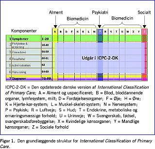 Summary Diagnostic classification in Denmark with emphasis on general practice Ugeskr Læger 2009;171(12):997-1000 Diagnostic classification may be used as a structure for the naming of health problems and to create an overview in electronic patient records. Classification also facilitates access to health information and decision support, quality improvement and research. The International Classification Primary Care is now included in the WHO's Family of International Classifications and was introduced into Danish general practice in 1998. This system will be updated to ICPC-2-DK in 2009. In secondary health care, the ICD-10 is currently in use but a new system (SNOMED-CT) is underway.