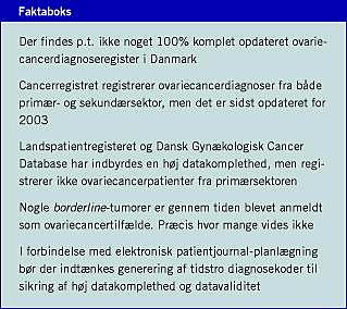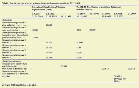 Borderline-tumor må ikke sidestilles med CO og har skiftet diagnosekode fire gange siden 1995. I to omgange har den haft egen specifik borderline -kode (DD391A), men har ellers hørt under uspecifikke maligne og nonmaligne ovarietumorer (Tabel 2). Fra den 1. juli 2005 til den 31. marts 2007 blev en borderline -tumor kodet som »neoplasma malignum ovarii uden specifikation« (DC569) plus borderline -morfologikoden (ZM99990 eller ZM8xxx1). Denne kodning er uhensigtsmæssig, dels fordi en borderline -tumor ikke er malign, dels fordi morfologikodningen ofte glemmes. Såfremt der ikke korrigeres for dette i opgørelser over ovariecancerincidens og overlevelse for den pågældende periode, vil der tegnes et urealistisk billede. I DGCD's årsrapport for 2005 var antallet af reelle ovariecancer- og borderline -diagnoser henholdsvis lavere og højere end hidtil registreret [9]. Da DGCD's histologiske diagnoseoplysninger indberettes direkte af patologerne, har disse data en høj validitet, selv om der også hos patologen foretages skøn ved vurdering af en given tumors histologi og oprindelse. Det er i Danmark lovpligtigt at anmelde både CO og borderline -tumorer til CR via LPR samt til DGCD og PDB, men den beskrevne borderline -problematik er ikke udelukkende et nationalt problem. I en undersøgelse fra England angives der i en tidligere undersøgelse at være ukorrekte histologiske data i over 20% af 241 indberettede ovarieneoplasier [10] .