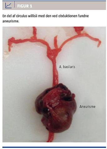 × 1 cm stort, tyndvægget, tromboseret aneurisme (Figur 1) med en knap 0,3 cm gennemgående bristning af aneurismets væg. Der var ingen andre aneurismer eller tumorer. Der sås trykpåvirkning af pons på aneurismets placering. Dødsårsag var således SAH på grund af et bristet aneurisme.