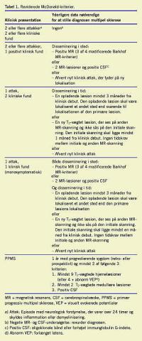 Andre har foreslået mindre stringent påvisning af disse-minering i sted, og patienter kan da også have MS, uden at ovenstående MR-kriterier er opfyldt (Tabel 1 ). Kriterierne er imidlertid ikke ændrede i den reviderede form, og fravigelser frarådes, indtil værdien af eventuelle andre kriterier måtte være vist i prospektive studier.