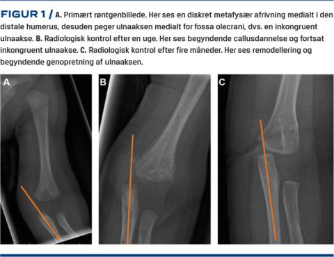 Et spædbarn blev behandlet på en børneafdeling en uge efter forløsning ved kejsersnit, idet venstre arm ikke kunne bevæges. Der blev taget et røntgenbillede af overarmen og albuen, og radiologisk kunne der beskrives en diskret metafysær afrivning medialt i den distale humerus (Figur 1). Barnet fik derfor anlagt en vinkelgipsskinne og blev set til kontrol på en ortopædkirurgisk afdeling en uge senere. I mellemtiden blev der foretaget underretning på mistanke om BCS. Ved den ambulante røntgenkontrol efter en uge, fandt man en komplet disloceret epifysiolyse i den distale humerus (EDH) (Figur 1B). Man fortsatte med gipsbehandlingen i yderligere to uger. Ved den afsluttende kontrol fire måneder postoperativt var der nærnormal bevægelighed i albuen med radiologisk remodellering (Figur 1).
