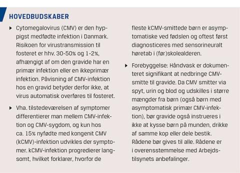 Kongenit cytomegalovirusinfektion (kCMV) er den hyppigste medfødte infektion med en prævalens på verdensplan på 0,2-2,2%, hvor prævalensen er 0,6-0,7% i de industrialiserede lande [1]. Der findes ingen national opgørelse for Danmark, da kCMV ikke er anmeldelsespligtig. I et dansk regionalt studie fra 1970’erne fandt man en incidens af kCMV på 0,4% [2].