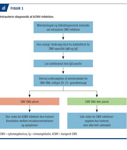 En CMV-infektion under graviditeten kan inficere placenta, ligesom fosteret kan inficeres. Ved kCMV vil fosteret udskille CMV via urinveje, og virus vil opkoncentreres i amnionvæsken. Den højeste sensitivitet ved PCR-analyse af amnionvæske for CMV-DNA opnås, hvis udtagelsen tidligst sker 6-7 uger efter en infektion, og hvis amniocentesen ikke er foretaget før 21-ugersgestationsalder [18]. Positiv CMV-PCR ved test på amnionvæske bekræfter CMV-infektion hos den gravide, ligesom fosteret anses for at være smittet. Et positivt CMV-PCR-resultat ved test på amnionvæske er ikke synonymt med CMV-sygdom og er derfor aldrig en abortindikation. De danske abortgrænser er 12 uger for abort uden krav om tilladelse og udgangen af uge 22 for abort efter samråd. Ved mistanke om kCMV ud fra resultater af serologiske undersøgelser og mistanke om fosterskader ved billeddiagnostik (ultralydskanning) kan man udtage amnionvæske til PCR-undersøgelse for CMV-DNA. En tværfaglig vurdering er afgørende, da der trods optimering forekommer falsk negative resultater i op til 15% af amniocenteser, som er udført efter retningslinjerne [19]. Et negativt CMV-PCR-resultat ved test af amnionvæske er imidlertid associeret med mildere forløb af kCMV og gode resultater af langtidsopfølgninger hos børnene, sandsynligvis fordi smitten er sket senere i graviditeten end i tilfælde med positivt PCR-resultat.