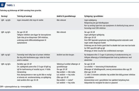 Hvis der hos gravide er symptomer, som er forenelige med CMV-infektion, uden anden kendt årsag, kan blod analyseres for CMV-specifikke IgM- og IgG-antistoffer. Kun omkring en tredjedel af de gravide med primær CMV-infektion udvikler mononukleoselignende symptomer, mens ikkeprimære infektioner sædvanligvis giver ingen eller uspecifikke symptomer som feber, træthed og muskelsmerter [13]. Kendskab til den gravides serostatus forud for eller tidligt i graviditeten kan være af betydning for bedre at kunne fastslå tidspunktet for infektionen og for at kunne skelne mellem primære og ikkeprimære infektioner (Tabel 1). Blod udtaget til double test i uge 8-11 gemmes på de fleste hospitaler og kan bruges til formålet, hvis det er opbevaret ved –20 °C eller herunder. IgG-serokonversion er guldstandard ved diagnostik af primærinfektion. Tolkningen af serologi kan imidlertid vanskeliggøres af flere forhold. For det første kan CMV-specifikt IgM vedvarende være til stede i lang tid efter en CMV-infektion. For det andet kan man vha. IgM-testen hverken skelne en primær fra en ikkeprimær CMV-infektion eller afgøre, hvor i forløbet af infektionen prøven er taget. For det tredje kan falsk positive IgM-resultater skyldes andre virale infektioner eller autoimmune sygdomme. En enkeltstående positiv IgM-test uden påvist IgG bør derfor altid afstedkomme en ny blodprøve efter 2-3 uger mhp. IgG-serokonversion. Samme blodprøve kan undersøges for CMV-DNA vha. PCR-teknik, hvor signifikant flere vil være positive i starten af en primær CMV-infektion [14] end ved en ikkeprimær infektion. Oftest findes såvel IgM som IgG ved undersøgelse af en blodprøve, og vha. supplerende aviditetstest kan man som oftest afgøre, om der er tale om en primær eller en ikkeprimær CMV-infektion.