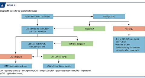 Ved mistanke om kCMV under graviditeten og i barnets første tre leveuger er det vigtigt at tage prøver fra det nyfødte barn (Figur 2). Maters serostatus bør altid afklares, inden man undersøger prøver fra barnet. Hvis mater er CMV-seronegativ og i øvrigt immunkompetent, er kCMV udelukket. Påvisning af CMV-DNA i urin anses for både mest sensitiv og specifik til påvisning af kCMV hos nyfødte, da CMV generelt detekteres i større mængde og i længere tid i urin end i blod. Spyt er også valideret til påvisning af CMV [21], men der er set falsk positive resultater især efter amning, hvorfor spytprøver tidligst skal tages en time efter amning [22]. Trods alvorlig kongenit CMV-sygdom ved fødslen kan CMV-DNA ikke altid påvises i blod, muligvis fordi CMV-smitte til fosteret er sket så tidligt i første trimester, at både mor og barn har cleared viræmien inden fødslen [23]. Resultatet af PCR-analyse for CMV-DNA på PKU-kortet, der tages 2-10 dage efter fødslen, kan bl.a. derfor være falsk negativt, og af den grund skrives der altid: »negativ CMV-PCR udelukker ikke kCMV« ud for resultatet »ikke påvist CMV«.