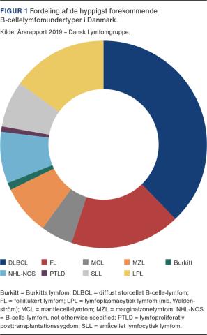Den reviderede fjerde udgave af WHO-klassifikationen omfatter 31 (28 definitive og tre provisoriske) B-cellelymfom (BCL)-undertyper med specifikke histomorfologiske, biologiske og/eller kliniske egenskaber. Der er over det seneste årti udviklet stadig mere følsomme molekylærdiagnostiske teknikker, hvilket har ført til en bedre forståelse af patofysiologien bag disse sygdomme. Et godt eksempel er den hyppigst forekommende lymfomundertype, diffust storcellet BCL (DLBCL) (Figur 1). Allerede i 2000 førte genekspressionsprofilering (GEP) til påvisning af to særskilte signaturer, en var knyttet til det germinale centers B-celle (GCB) og en til den aktiverede B-celle (ABC) som oprindelse til den maligne cellepopulation [2]. GEP blev senere oversat til immunhistokemiske algoritmer, der i dag anvendes i rutinediagnostik af DLBCL [3].