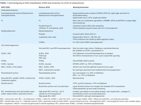 Den fjerde udgave af WHO’s klassifikation af lymfoide neoplasier fra 2008 blev senest revideret i 2016 [1]. Tabel 1 og Tabel 2 viser de vigtigste opdateringer for henholdsvis B- og T/NK-cellelymfomer inkl. kommentarer til molekylære abnormiteter med diagnostiske, prognostiske og terapeutiske implikationer.