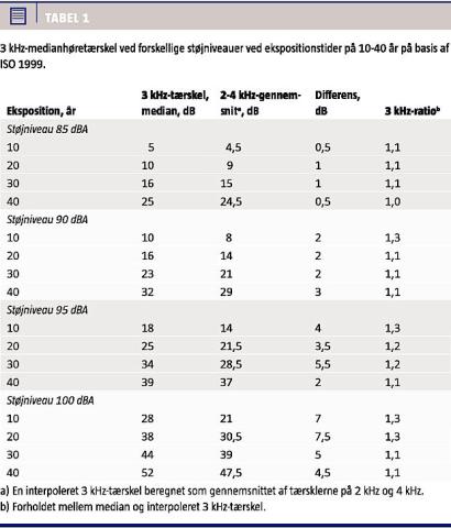 1) Tærsklen på 2 kHz påvirkes kun beskedent og bliver praktisk taget ikke dårligere end 35 dB. Den forringes først til mere end 25 dB ved en eksposition på 95 dBA i 40 år eller ved en eksposition på 100 dBA i 30 år.
