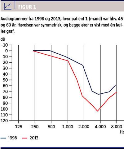 En 45-årig mekaniker blev efter en gennemsnitlig daglig støjeksposition på 85-90 dBA gennem 25 år undersøgt i 1998. Der var ingen disposition til hørenedsættelse. Audiogrammet (Figur 1) viste symmetriske høretærskler med SKI-konfiguration og et bredt U-formet diskanthøretab på 70 dB. Sagen blev anmeldt og anerkendt som arbejdsskade, men han fik afslag på erstatning, fordi menet blev sat til mindre end 5%. I de følgende år, hvor han ikke var i støj, var der gradvis progression, og i 2013 var der i forhold til 1998 sket en 50 dB stor forringelse på 2 kHz. Hans