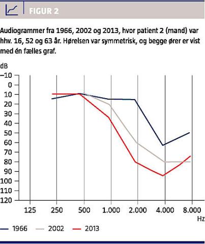 Som 16-årig havde denne mand i 1966 en 65 dB dyb tak på 4 kHz på begge ører (Figur 2). Både hans mor og moster havde nedsat hørelse. Fra han var 19 til 25 år, arbejdede han i støj på 85-90 dBA ca. fire timer dagligt. Som 46-årig (1996) havde han et symmetrisk SKI-audiogram, idet der var sket en 40 dB-forværring på 2 kHz og lidt mindre på 4 kHz og 8kHz. Det var uændret i 2002 og 2007, men i 2013 faldt hørelsen nu stejlt allerede fra 0,5 kHz til et bredt U-formet diskanthøretab på 90 dB. Hans 3 kHz-ratio var kun 1,0 på grund af den store hørenedsættelse på 2 kHz.