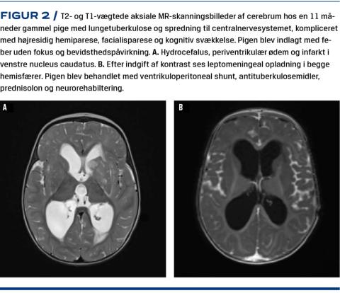 Klassiske symptomer på tb er hoste i mere end 2-3 uger, feber, vægttab, træthed og nattesved. På trods af omfattende sygdom kan børn have uspecifikke symptomer og objektive tegn og kan debutere med dårlig trivsel, nedsat aktivitetsniveau og symptomer, der kan mistolkes som almindelige luftvejsinfektioner. Lunge-tb er den hyppigste sygdomsmanifestation [6, 7]. Ofte er der sparsomme fund på røntgenbilleder af thorax, men i forskelligt omfang kan der ses kaviteter, persisterende lungeinfiltrater, atelektase, intratorakal lymfadenopati, bronkial obstruktion og/eller pleuraansamlinger som hos voksne [10]. Ekstrapulmonal tb er hyppigere hos børn end hos voksne og ses hos ca. 25% af de afficerede, ofte i lymfeknuderne, men alle organer kan afficeres, og spektret af symptomer og kliniske fund er derfor meget bredt [7]. Tuberkuløs meningitis og miliær tb er forbundet med en høj mortalitet og risiko for sequelae, særligt hos immunsupprimerede og små børn (Figur 2) [11]. Som differentialdiagnose bør tb-meningitis overvejes hos alle børn med bevidsthedspåvirkning, særligt ved risikofaktorer såsom hiv-infektion, immunsuppression, forældre fra højendemiske lande m.m.