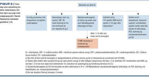 Udredning bør igangsættes på nærmeste børneafdeling ved mistanke om aktiv tb. Induceret sputum og/eller ventrikelskyl undersøges ved mistanke om lunge-tb, idet mindre børn sjældent er i stand til at frembringe ekspektorat [13]. Prøverne sendes til Statens Serum Institut (SSI), hvor der foretages direkte tests samt fæno- og genotypisk resistensbestemmelse (Figur 3). Dette er yderst vigtigt, da mindst 11% af børn med tb i Danmark har resistente isolater [7]. Der findes flere kliniske algoritmer, som kan anvendes i diagnostikken af tb, men disse benyttes hovedsageligt i lavindkomstlande [15].
