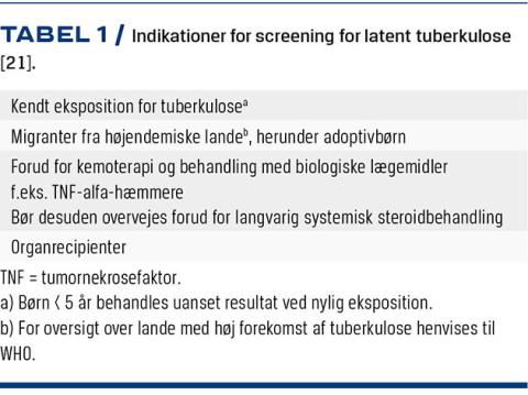 Screening for LTBI bør foretages blandt risikogrupper med grundig anamnese og objektiv undersøgelse samt TST- og/eller IGRA-test (Tabel 1) [19]. Ved positive tests suppleres med røntgenbilleder af thorax for at udelukke lunge-tb. Det er vigtigt at screene børn forud for behandling med biologiske lægemidler, da denne gruppe af sekundært immunsupprimerede må formodes at være stigende og i høj risiko for reaktivering.