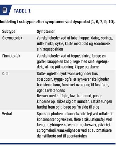 De motoriske vanskeligheder ved dyspraksi spænder bredt og rækker fra påvirkede viljestyrede bevægelser af ekstremiteter til øjenmuskler, muskler der er involveret i artikulation, ansigtets mimiske muskler, læber, tunge og bløde gane samt dertilhørende påvirkede funktioner som f.eks. almindelige hverdagsaktiviteter [4], øjenbevægelser [5], tale [6], ikketalerelaterede orofaciale funktioner som at sutte, tygge og synke [3]. I international litteratur anvendes inddelingen ekstremitetsapraksi, taleapraksi og ikketalerelateret oral apraksi, hvor betegnelsen apraksi (uden handling) anvendes af nogle forskere, skønt der ikke er tale om mangel på bevægelser, men snarere påvirkning af bevægelser [3]. I Danmark anvendes følgende dyspraksiinddeling: finmotorisk, grovmotorisk, oral og verbal [7, 8] (Tabel 1). Symptomatologi og behandling adskiller sig dog på flere punkter væsentligt for oral og verbal dyspraksi, hvorfor disse undertyper vil blive beskrevet særskilt i en anden artikel [11].