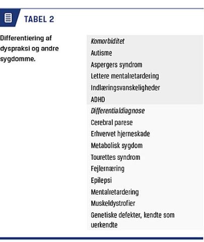 og adfærdsmæssige vanskeligheder, som bør betragtes som komorbiditeter frem for en integreret del af dyspraksien [1]. Koordinationsvanskeligheder, som er karakteristiske for dyspraksien, kan også være tegn på andre medicinske tilstande, neurologiske lidelser eller mental retardering [10]. I andre tilfælde kan et barn have fået diagnosen dyspraksi i en periode, inden man har fundet den rette forklaring, hvorefter det ved debut af f.eks. epilepsi kan vise sig, at barnet har et epileptisk syndrom [21], hvormed både den forsinkede motoriske udvikling (fin- som grovmotorisk) og de sproglige vanskeligheder kan forklares. Andre komorbiditeter og differentialdiagnoser er nævnt i Tabel 2.